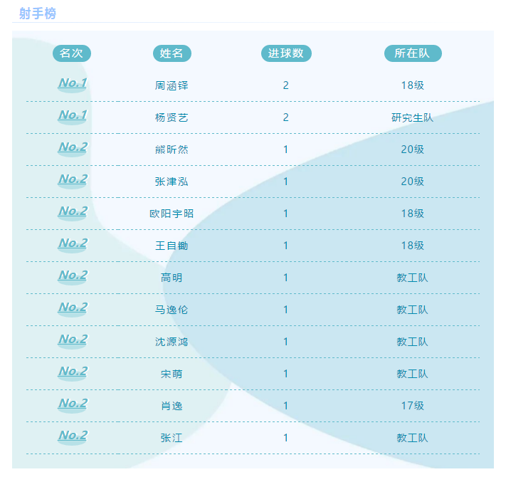 本场比赛结束后,B组小组赛全部结束,18级本科生队两战全胜积六分以小组头名晋级,研究生队与20级本科生队一平一负同积一分,净胜球也相同。但是20级刘锦帅同学在比赛中吃到黄牌一张,研究生队则没有黄牌,故研究生队以小组第二晋级。让我们恭喜这两支球队。