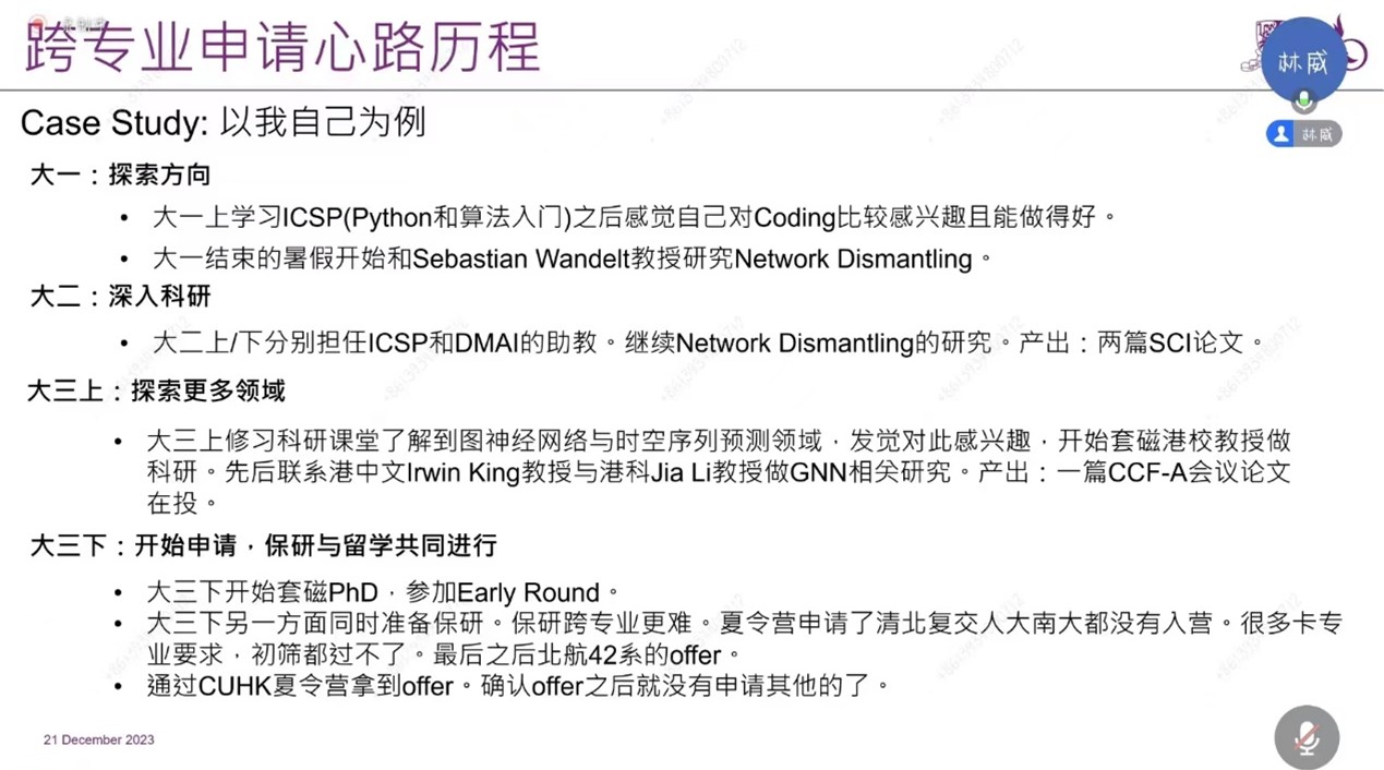 林威首先分享了自己跨专业申请的心路历程,他从本科的机械工程成功跨专业申请了计算机博士。他结合目前各领域发展现状,在兴趣的引导下决定跨专业申博,并为此做了一系列转专业的准备,包括制定规划、补充CS基础知识、了解研究方向等。他也讲述了自己为申请而进行的科研规划,包括大一的探索方向、大二的深入科研、大三探索更多领域以及在大三的申请阶段的准备思路。