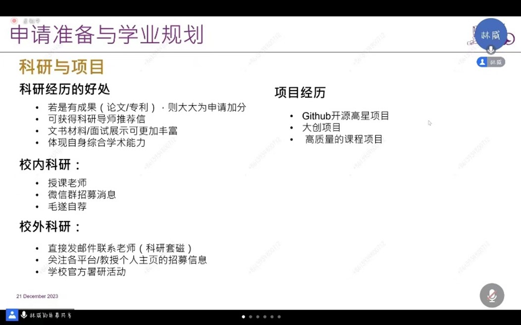 随后,林威重点讲述了自己的申请准备和学业规划。林威同学列明了GPA、语言成绩以及GRE成绩的申请条件,并就提高成绩、准备时间方面提出相关的建议;科研项目可以体现学生自身的综合学术能力,因此在申请过程中也非常重要,校内科研和校外科研也有许多途径可供同学们选择,比如学校官方暑研活动;竞赛经历也对申请有很大的加分,比如ACM国际大学生程序设计竞赛(ACM-ICPC)、Kaggle/天池、美国大学生数学联模比赛(MCM-ICM)等。