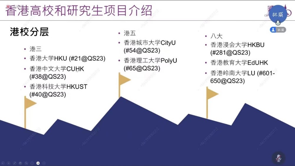 接下来林威向同学们介绍香港高校和研究生项目,并且分享了自己申请香港留学项目时的情况与相关经验。他介绍了港校中“港三”“港五”“八大的分层情况”,帮助同学们了解了港校的整体情况;港校中的研究生项目分为授课型研究生、研究型研究生以及研究助理,各项目设置门槛不同,学习方式也存在较大的差异。