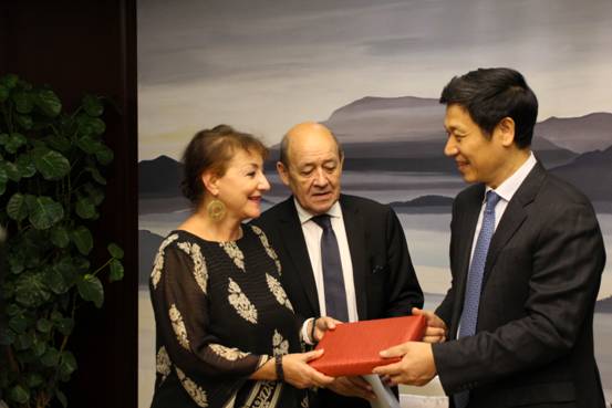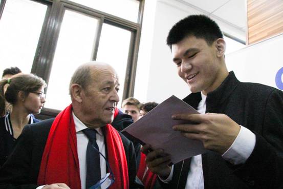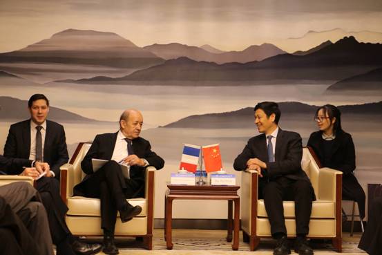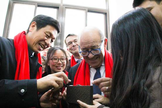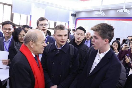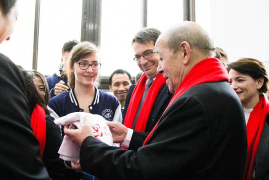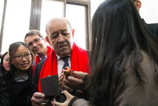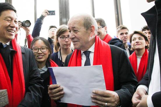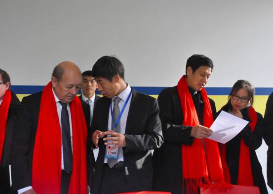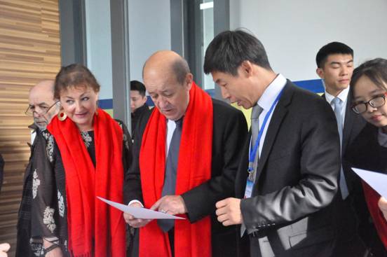 11月25日上午10点40分,法国欧洲和外交部长让-伊夫•勒德里昂携夫人玛丽昂•勒德里昂女士一行二十多人准时出现在了如心会议中心楼下。校长徐惠彬院士、副校长黄海军接待了勒德里昂先生一行。法国驻华大使黎想阁下、法国政府及驻华使馆官员、beat365官网中方院长洪冠新、法方院长福乐吉等随行并出席各项活动。