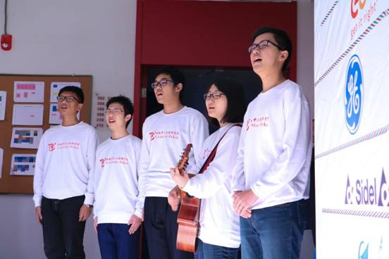 走进二号楼,走上台阶,在二号楼大厅里,五位中国同学给来宾们带来一首《La Vie EnRose》。这首优雅的歌曲,拉开了今天参观之行的序幕。