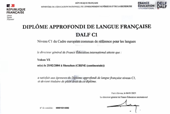 语言的探索从不停步,两年法语深耕后,他在大三上学期成功考取DALF C1文凭,成为学院预科阶段近年来首位获此殊荣的学生。