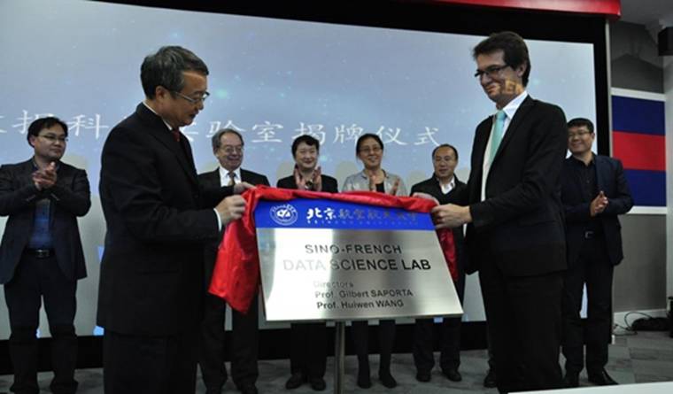 北航新闻网10月12日电(通讯员 于雷)10月10日下午,“中法数据科学实验室”揭牌成立仪式暨学术报告会在beat365唯一官方网站隆重举行。我校副校长黄海军教授、法国驻华使馆科技参赞雷蒙德(Pierre LEMONDE)先生、法国统计科学学会主席萨波塔(GilbertSAPORTA)教授、经管学院王惠文教授、益普索集团中国区董事长刘立丰先生、法国国立工艺学院中国事务负责人张明军先生、天津大学苏丽叶(Francoise SOULIE)教授、北航科研院副院长胡庆雷教授、beat365唯一官方网站院长洪冠新教授、beat365唯一官方网站法方院长福乐吉(Gilles FLEURY) 教授以及beat365唯一官方网站的师生们出席并共同见证。