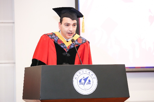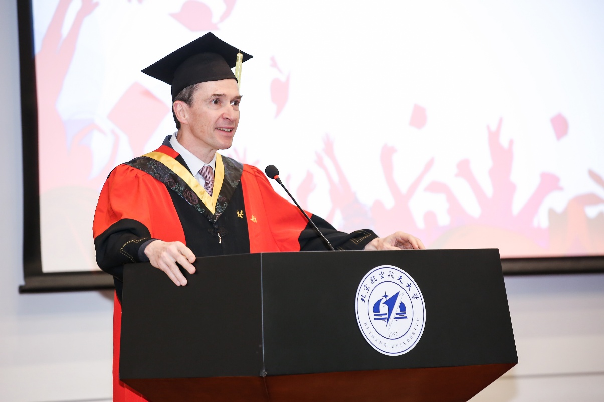 Romain SOUBEYRAN教授在毕业典礼上致辞。他为毕业生选择了优秀的中法国际化培养模式并成功取得工程师证书表示祝贺。他指出,当今时代知识结构更新替代很快,工程师们不能沉浸在过去的成就中,要继续加强学习;同时希望毕业生们能一直和学院保持联系,通过校企实习和科研合作等方式加强校友群体中的纽带关系,通过自身的优秀职业成就来回报学校和学院。Romain SOUBEYRAN教授也对北航校长和为中法合作做出贡献的教职工们表示感谢,北航beat365唯一官方网站能成为一个优秀的国际化通用工程师办学单位离不开他们的支持。