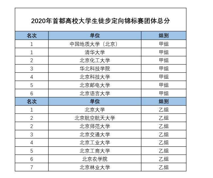 2020年11月28至29日,由北京市大学生体育协会主办、中国地质大学(北京)承办、北京市大学生体育协会户外运动分会执行、北京市指北针体育发展有限公司协办的2020年首都高校大学生徒步定向锦标赛完美落幕。共有25所首都高校的240多名学生参加该赛事。由北航定向越野协会成员组成的北航参赛队在团体赛中获得乙组(甲组为特长生,乙组为非特长生)团体总分第二名,且短距离定向比赛荣获冠军。