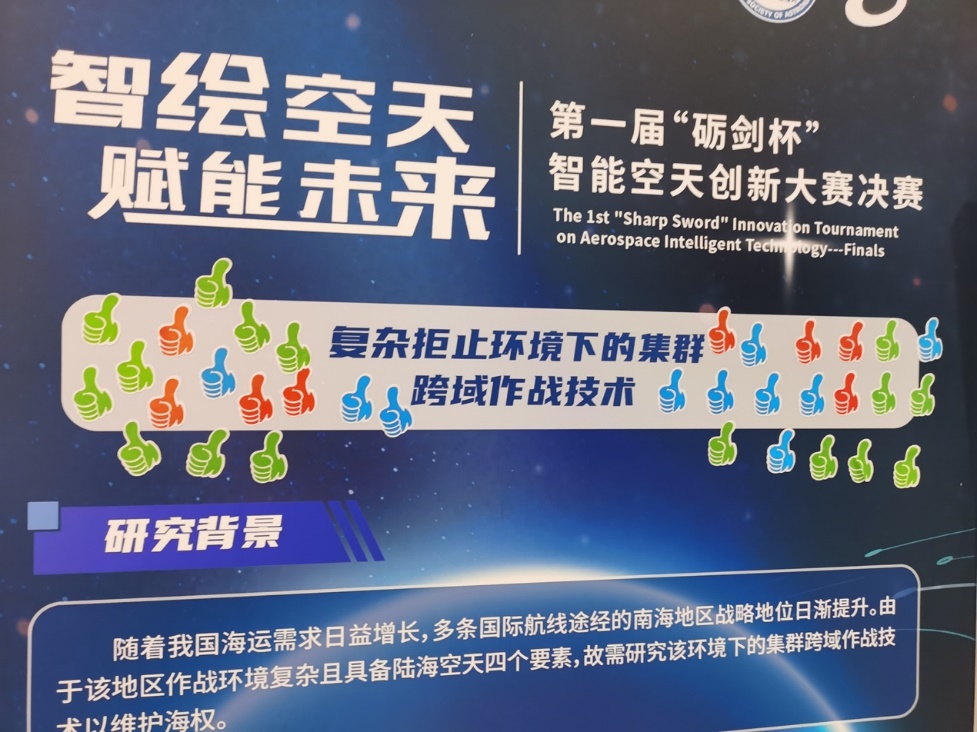 大赛分为路演和发布两个环节,评审人员进入路演会场签到,领取点赞贴纸(每人 6 个赞),参观每个路演展台。每个项目向评审人员介绍项目情况,评审人员根据路演效果决定是否点赞,路演环节设置人气奖 2 个。路演结束后,组委会统计每个项目点赞情况,点赞总数前 2 名的项目获评第一届“砺剑杯”智能空天创新大赛“路演人气奖”。