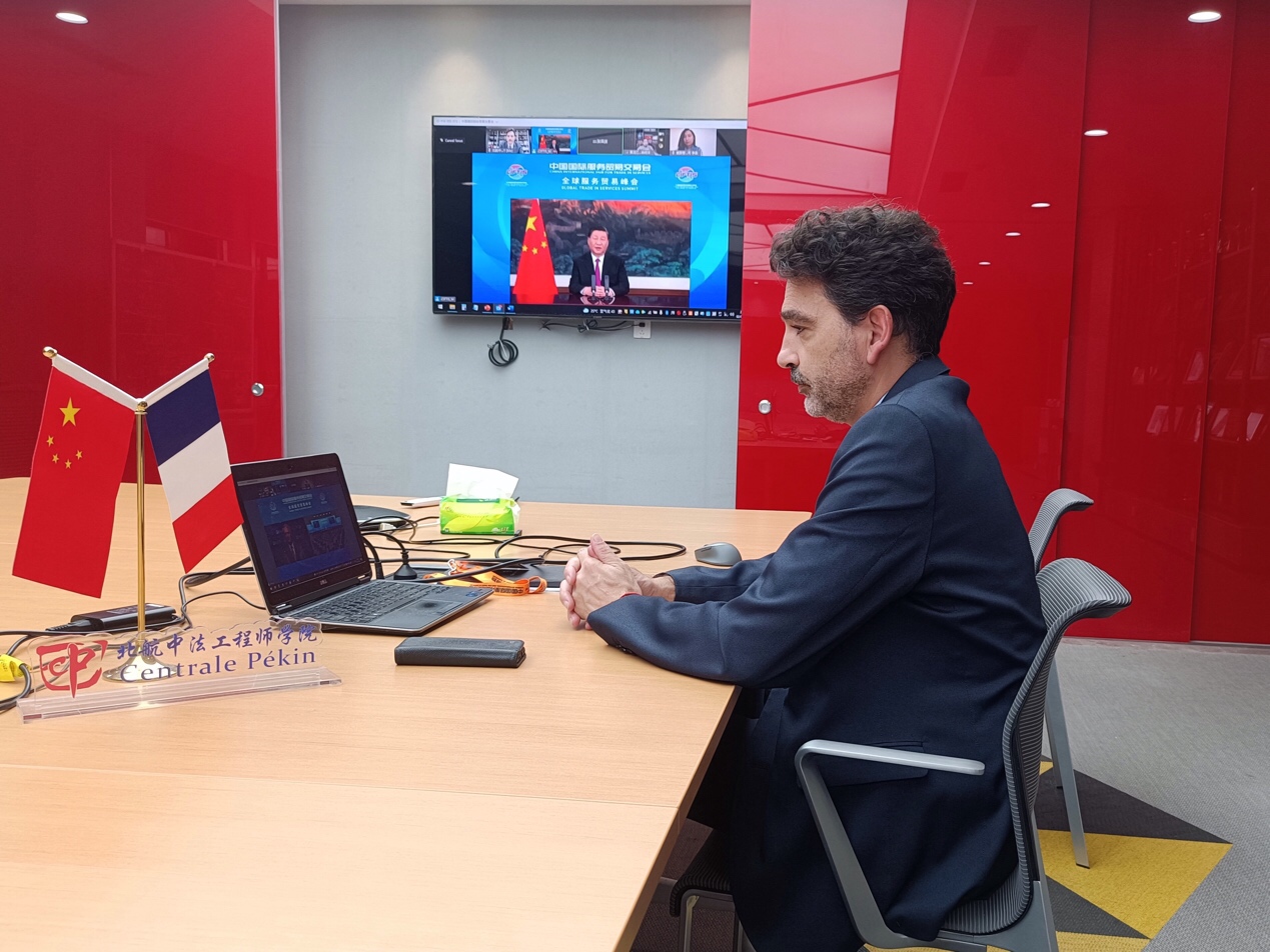 2021年中国国际服务贸易交易会(简称服贸会)于9月2日至7日在北京举行,国家主席习近平9月2日在本届服贸会全球服务贸易峰会上发表视频致辞。beat365唯一官方网站法方院长Frédéric GENTY受服贸会组委会邀请,当天以线上视频的形式在beat365官网会议室参加了本届服贸会全球服务贸易峰会。