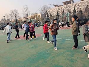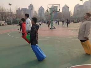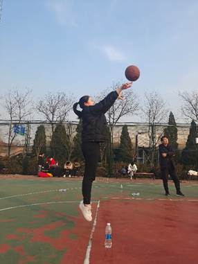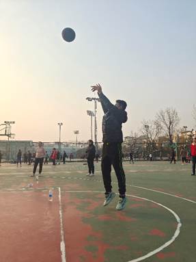 注:212416班班主任宋萌老师与学生一起投篮