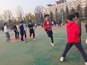 在跳大绳环节中,同学们轻盈跳跃,衣摆飘动。长绳翻飞,尘灰扬起,追求着速度与节奏。