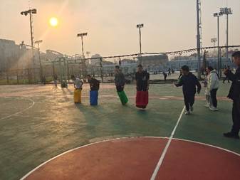 在袋鼠跳环节中,同学们握紧布袋,神经冲动传达至腿部肌肉,肌肉收缩,一跃而起,扰动微风,奔向终点。
