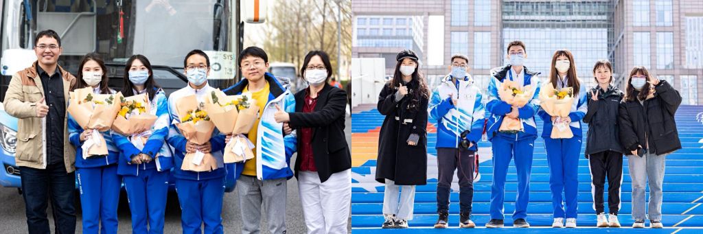 中法分团委书记张莉和专职辅导员姜淼,国通半脱产辅导员范文捷和李嘉宝等前来迎接最后一批返航的志愿者,大家眉眼间隐藏不住的是重逢的喜悦。现场为志愿者们精心准备了花束,感谢志愿者们在冬奥、冬残奥期间为国家争光、为学院添彩。