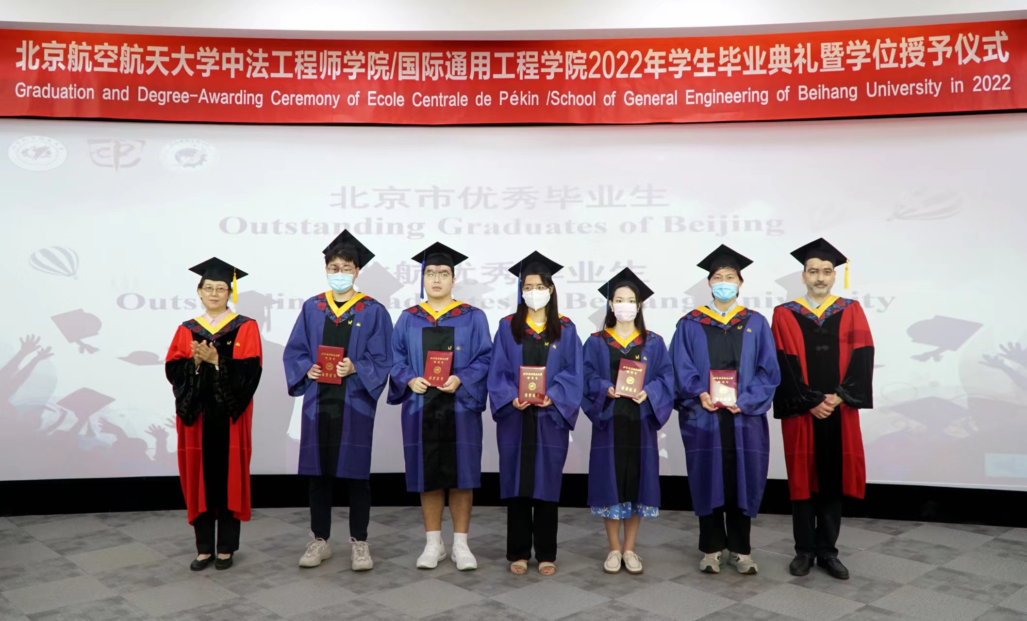 回到学院分会场,学院党委书记张江宣布获北京市优秀毕业生与北航优秀毕业生名单,洪冠新院长和GENTY院长为优秀毕业生代表颁奖。