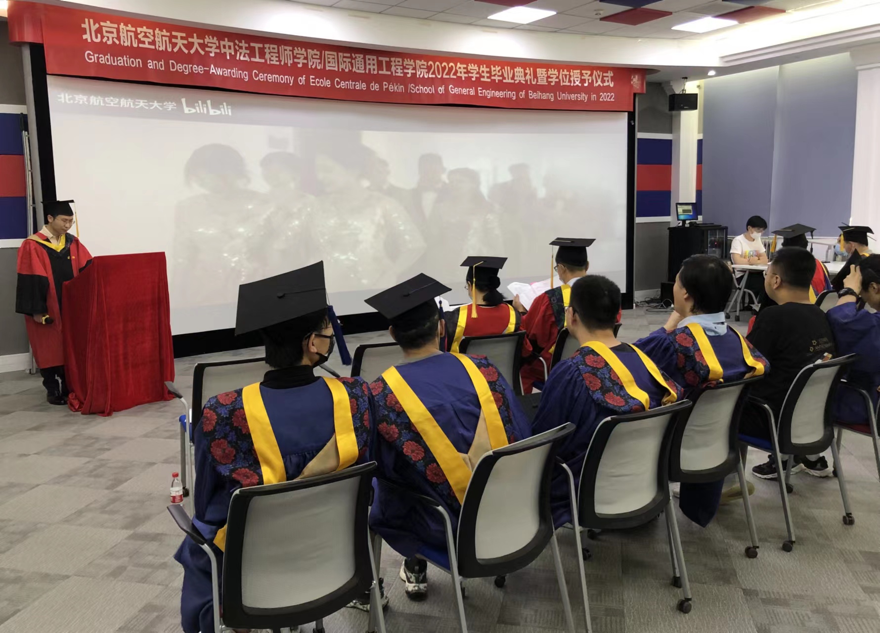 2022年6月18日上午,beat365唯一官方网站/国际通用工程学院2022年学生毕业典礼暨学位授予仪式在二号楼智慧教室举行。此次毕业典礼采取线上线下相结合方式进行,学院分会场与学校主会场毕业典礼同步进行,毕业生通过主会场、分会场以及居家观看直播多种形式参加了毕业典礼。学院院长洪冠新,党委书记张江,法方院长GENTY,副院长王敏,副院长张巍在学院分会场出席典礼。副院长殷传涛主持。