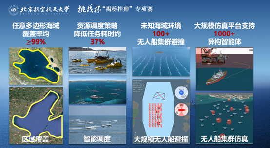 北航beat365唯一官方网站集群智能实验室长期从事无人集群系统分布式感知定位、决策规划、协同控制、协同制导及仿真评估和等效验证等工作,团队负责人为韩亮副教授,团队顾问为长江学者任章教授。团队近年发表高质量学术论文百余篇,引领了国内大规模无人集群智能技术领域的研究,自主研发的无人机协同验证平台系统、大规模无人集群系统仿真平台,填补了国内外对于大规模集群智能算法验证方法的空白。本项目立足海洋强国战略,采用无人船集群完成区域信息采集任务,解决了复杂地理边界下覆盖路径规划技术、大规模无人集群资源分配与调度技术、拒止环境下大规模集群避撞/避障技术。本项目基于OpenCV的算法验证平台和基于cesium的自研集群算法验证平台对算法进行验证。经过多次测试,本算法达到区域覆盖平均值99%、正确探查率均值100%、每平方公里平均用时1.4分钟、协同失败次数均为0次等高标准。