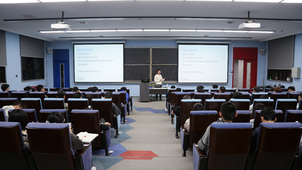 紧接着,韩绍航向同学们详细介绍了留学申请中需要做的准备工作和注意事项。他强调在决定出国后首先要志向高远,敢于以申请世界顶级高校为目标而努力,排名越靠前的高校往往能够在之后的学习中有更多的基金和科研经费支持。留学申请的关键是学业成绩,较高的GPA是欧洲顶级院校的入门条件,同时申请硕士的加分项是科研项目的参与,而申请博士的必要条件是论文的产出。