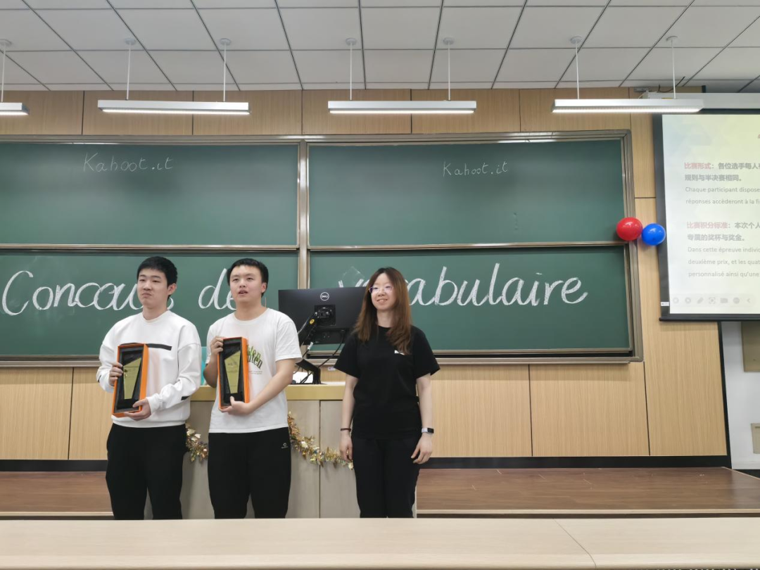 这一环节考察数学物理的TD题目、综合法语词汇、看图识词以及单词乱序还原,一共70道题。这一环节,利用了法国同学推荐的Kahoot.it网站,多彩的页面和全新的答题模式极大地提高了同学们的积极性,也使同学们得到了放松。然而题目的难度逐渐提高,问题与选项都变得复杂难懂起来。同学们从最开始的漫不经心,逐渐转变为了之后的全神贯注。不过,题目的趣味性让现场的氛围多了一丝轻松活跃,少了一些紧张严肃。同学们其乐融融,为实时更新的排行榜感叹不已。