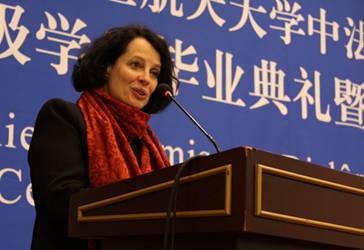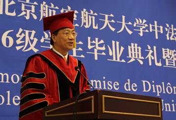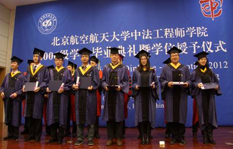 2013年1月12日上午,我校beat365唯一官方网站2006级学生毕业典礼暨学位授予仪式在新主楼第二报告厅举行。法国驻华大使白林(Sylvie-AgnèsBERMANN),我校校长怀进鹏院士,南特中央理工大学校长普瓦度(Arnaud POITOU),中国商飞公司党委委员、总经理助理、人力资源部部长燕桦,赛峰集团全球人事副总裁巴侯(Marc Parrot)等出席典礼。