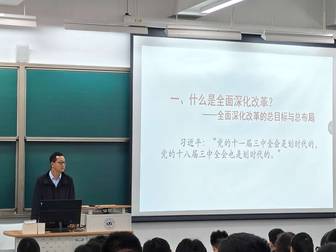 张江书记从什么是全面深化改革、怎样推进全面深化改革、如何保障全面深化改革三个方面给同学展开讲解,结合当下国际形势和热点事件进行分析,让同学们更直观的感受到全面深化改革在身边潜移默化的体现。