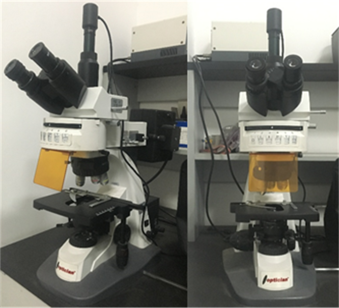 荧光显微镜是以紫外线为光源,用以照射被检物体,使之发出荧光,然后在显微镜下观察物体的形状及其所在位置。而落射荧光显微镜与荧光显微镜的主要区别在于落射光装置,新型的落射光装置是从光源来的光射到干涉分光滤镜后,波长短的部分(紫外和紫蓝)由于滤镜上镀膜的性质而反射。当滤镜对向光源呈45度倾斜时,波长短的部分则垂直射向物镜,经物镜射向标本,使标本受到激发,这时物镜直接起聚光器的作用;同时,波长长的部分(绿、黄、红等),对滤镜是可透的,因此不向物镜方向反射。滤镜起了激发滤板作用,由于标本被激发的荧光处在可见光长波区,可透过滤镜而到达目镜观察。荧光图像的亮度随着放大倍数增大而提高,在高放大时比透射光源强。它除具有透射式光源的功能外,更适用于不透明及半透明标本,如厚片、滤膜、菌落、组织培养标本等的直接观察。